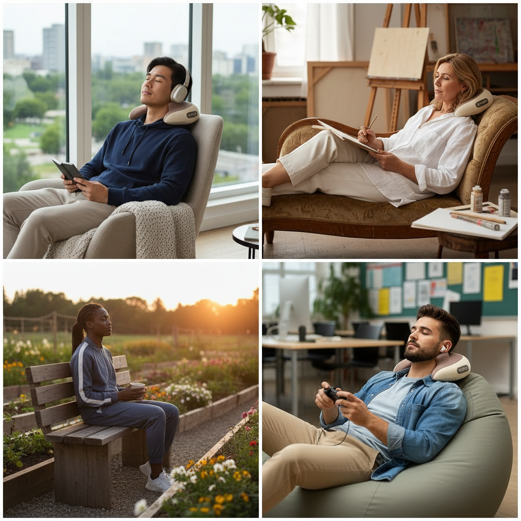 Hisoo’s four precision points gently support your neck, moving with the care of experienced hands. Warmth spreads through every muscle, and that familiar, lingering ache slowly fades away.